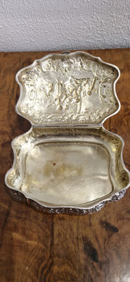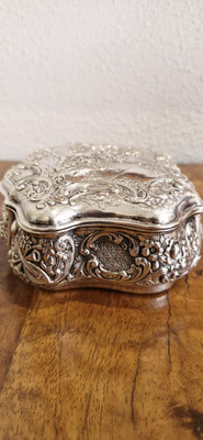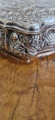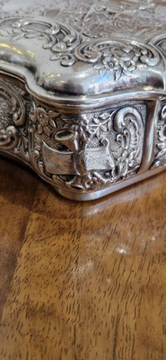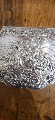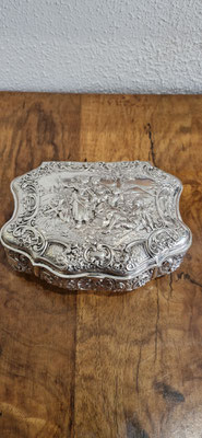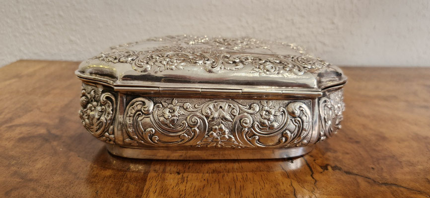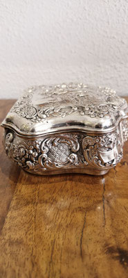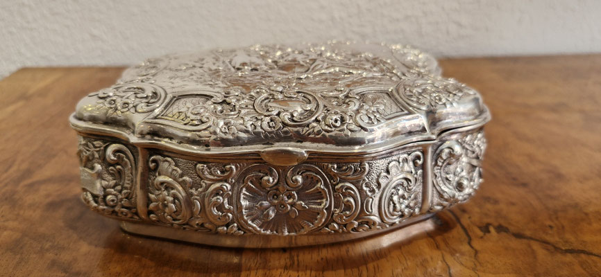 sehr schöne, große Zuckerdose / Gebäckdose aus 800er Silber, gefertigt in Deutschland ca. 1890-1910, Innenvergoldung, verziert auf dem Deckel mit einer romantischen Allegorie umrandet von floralen Rocailles, seitliche ebenso florale Verzierungen Musikinstrumente und Notenblätter, 16cm x 12cm x 6,5cm, Gewicht: 421g, sehr guter Zustand