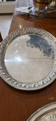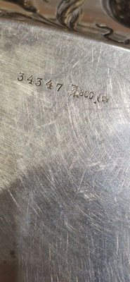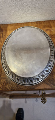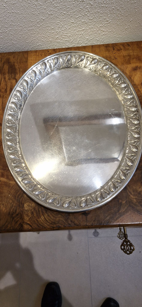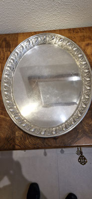 großes, ovales Tablett aus der Zeit des Jugendstils, gefertigt von Koch & Bergfeld, gegr.1859 in Bremen, aus 800er Silber, der Rand ist mit typischen floralen Jugendstil Motiven verziert , der Spiegel ist glatt mit normalen, wenigen Gebrauchsspuren, guter gebrauchter Zustand, nicht hochglanz poliert; Maße: 40 x 32 cm, Gewicht 726g